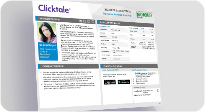 BIG DATA & ANALYTICS Experience Analytics Company SPEAKER PROFILE KEY COMPANY FACTS ▪ Liraz Margalit, PhD, is a Web Psychologist, a Key Corporate Facts Traffic Jan-17 Jan-18 Keynote Speaker and Head of Behavioral Research Headquarters Ramat Gan, Israel Unique Users 63k 34k at Clicktale ▪ She integrates Cognitive Psychology and Behavioral Founded 2006 Visits 168k 77k Economic perspectives to analyzes online consumer Employees 100-1,000 behavior and deliver actionable insights for business Minutes 07:18 10:48 stakeholders Active Markets International ▪ She is a lecturer at the department of media and Sessions Mobile: 10% Mobile: 19% communication at the IDC. Her consumer behavior Funding $60m Desktop: 90% Desktop: 81% research was awarded with the OBE, Online Jan 2018 Direct: 51%, Search: 24%, Dr. Liraz Margalit Business Excellence for 2016 as well as the Best of Ownership Private – VCs Sources Referrals: 21%, Other: 4% WebPsychologist, Neuromarketing 2016 and was chosen as CMSWire contributor of the year 2017 Key Investors KKR, Amadeus Capital Partners, Head of ▪ Her research papers and studies can be found in top Viola Behavioral business magazines such as Entrepreneur, NOAH Content Clicktale at NOAH Research TechCrunch and Forbes. She also writes an ongoing Website clicktale.com blog for Psychology Today named “Behind Online Behavior” COMPANY PROFILE CLICKTALE @ NOAH Doing Business @ NOAH Main Presentation Topics ▪ Clicktale taps into the wisdom and behavior of millions of visitors to help businesses deliver amazing digital experiences to their customers Present your business proposal through 1. Digital Body Language, Personalization, ▪ Our unique behavioral data, clear visualizations, and world-class customer NOAH Connect app Customer Experience AI, Digital experience expertise give enterprises concrete answers to their critical Psychology, Data Science questions so they can maximize success on every digital channel 2. Customer Experience ▪ The pioneer in Experience Analytics, Clicktale marries cognitive computing, 3. Digital Body Language machine learning and psychological research to automatically surface issues 4. Data Science/AI and answer questions that keep executives up at night Attendees @ NOAH Liraz Margalit, Head of Behavioral Research Merav Keren, Head of Digital 29