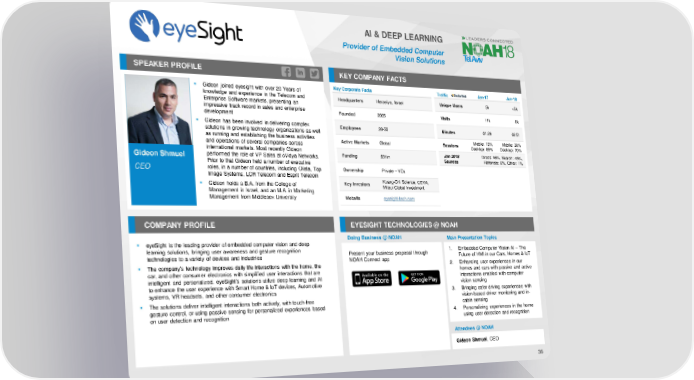 AI & DEEP LEARNING Provider of Embedded Computer Vision Solutions SPEAKER PROFILE KEY COMPANY FACTS ▪ Gideon joined eyesight with over 20 Years of Key Corporate Facts Traffic Jan-17 Jan-18 knowledge and experience in the Telecom and Headquarters Herzeliya, Israel Unique Users 5k <5k Enterprise Software markets, presenting an impressive track record in sales and enterprise Founded 2005 Visits 11k 8k development ▪ Gideon has been involved in delivering complex Employees 26-50 Minutes 01:29 02:51 solutions in growing technology organizations as well as running and establishing the business activities Active Markets Global Sessions Mobile: 15% Mobile: 30% and operations of several companies across Desktop: 85% Desktop: 70% international markets. Most recently Gideon Funding $31m Jan 2018 Direct: 46%, Search: 45%, Gideon Shmuel performed the role of VP Sales at cVidya Networks. Sources Referrals: 8%, Other: 1% Prior to that Gideon held a number of executive CEO roles, in a number of countries, including Olista, Top Ownership Private – VCs Image Systems, LCR Telecom and Esprit Telecom ▪ Gideon holds a B.A. from the College of Key Investors Kuang-Chi Science, CEVA, Management in Israel, and an M.A. in Marketing Mitsui Global Investment Management from Middlesex University Website eyesight-tech.com COMPANY PROFILE EYESIGHT TECHNOLOGIES @ NOAH Doing Business @ NOAH Main Presentation Topics ▪ eyeSight is the leading provider of embedded computer vision and deep learning solutions, bringing user awareness and gesture recognition Present your business proposal through 1. Embedded Computer Vision AI – The technologies to a variety of devices and industries NOAH Connect app Future of HMI in our Cars, Homes & IoT 2. Enhancing user experiences in our ▪ The company’s technology improves daily life interactions with the home, the homes and cars with passive and active car, and other consumer electronics with simplified user interactions that are interactions enabled with computer intelligent and personalized. eyeSight’s solutions utilize deep learning and AI vision sensing to enhance the user experience with Smart Home & IoT devices, Automotive systems, VR headsets, and other consumer electronics 3. Bringing safer driving experiences with ▪ The solutions deliver intelligent interactions both actively, with touch-free vision-based driver monitoring and in- gesture control, or using passive sensing for personalized experiences based cabin sensing on user detection and recognition 4. Personalizing experiences in the home using user detection and recognition Attendees @ NOAH Gideon Shmuel, CEO 36