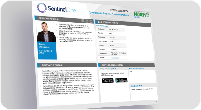 CYBERSECURITY Cybersecurity Endpoint Protection Platform SPEAKER PROFILE KEY COMPANY FACTS ▪ Tomer co-founded SentinelOne in 2013. He is Key Corporate Facts responsible for the company’s direction, products, Headquarters Palo Alto, CA, US and services strategy ▪ Before SentinelOne, Tomer led product development Founded 2013 and strategy for the Toluna Group as a VP of Products Employees 101-1,000 ▪ Prior to that he held several application security and consulting roles at various enterprises, and was CTO Active Markets Global at Carambola Media Tomer Funding $110m Weingarten Ownership Private – VCs Co-Founder & Redpoint, Third Point Ventures, CEO Key Investors Tiger Global Website sentinelone.com COMPANY PROFILE SENTINEL ONE @ NOAH Doing Business @ NOAH Main Presentation Topics ▪ SentinelOne is shaping the future of endpoint security with a uniquely integrated platform that combines behavioral-based detection, advanced Present your business proposal through N/A mitigation, and forensics to stop threats in real-time. Specializing in attacks NOAH Connect app that utilize sophisticated evasion techniques, SentinelOne is the only vendor who offers complete protection against malware, exploit and insider-based attacks. This led Gartner to recognize SentinelOne as a Visionary in their recent Endpoint Protection Magic Quadrant ▪ SentinelOne is also the only next-generation endpoint protection company to be independently certified as a true antivirus replacement for Windows, OS X, Attendees @ NOAH and Linux, including certification for both HIPAA and PCI. SentinelOne was formed by an elite team of cyber security and defense experts from IBM, Intel, Tomer Weingarten, Co-Founder & CEO Check Point Software Technologies, McAfee, and Palo Alto Networks 73
