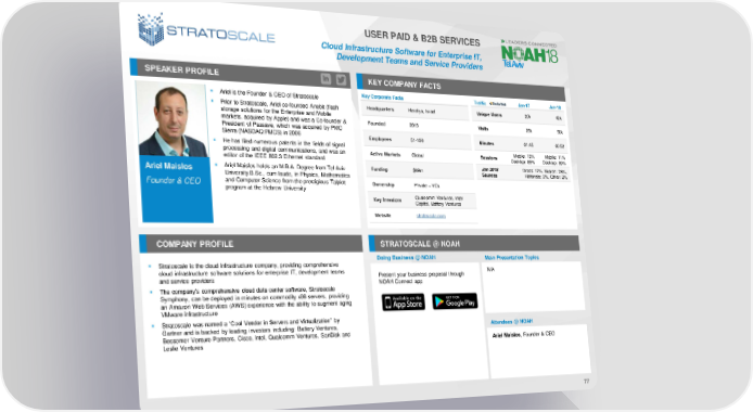 USER PAID & B2B SERVICES Cloud Infrastructure Software for Enterprise IT, DevelopmentTeamsand Service Providers SPEAKER PROFILE KEY COMPANY FACTS ▪ Ariel is the Founder & CEO of Stratoscale Key Corporate Facts Traffic Jan-17 Jan-18 ▪ Prior to Stratoscale, Ariel co-founded Anobit (flash Headquarters Herzliya, Israel Unique Users 20k 42k storage solutions for the Enterprise and Mobile markets, acquired by Apple) and was a Co-founder & Founded 2013 Visits 26k 50k President of Passave, which was acquired by PMC Sierra (NASDAQ:PMCS) in 2006 Employees 51-100 Minutes 01:45 00:52 ▪ He has filed numerous patents in the fields of signal Mobile: 15% Mobile: 11% processing and digital communications, and was an Active Markets Global Sessions Desktop: 85% Desktop: 89% editor of the IEEE 802.3 Ethernet standard ▪ Ariel Maislos holds an M.B.A. Degree from Tel Aviv Funding $69m Jan 2018 Direct: 17%, Search: 78%, Ariel Maislos University.B.Sc., cum laude, in Physics, Mathematics Sources Referrals: 3%, Other: 2% Founder & CEO and Computer Science from the prestigious Talpiot Ownership Private – VCs program at the Hebrew University Key Investors Qualcomm Ventures, Intel Capital, Battery Ventures Website stratoscale.com COMPANY PROFILE STRATOSCALE @ NOAH Doing Business @ NOAH Main Presentation Topics ▪ Stratoscale is the cloud infrastructure company, providing comprehensive cloud infrastructure software solutions for enterprise IT, development teams Present your business proposal through N/A and service providers NOAH Connect app ▪ The company’s comprehensive cloud data center software, Stratoscale Symphony, can be deployed in minutes on commodity x86 servers, providing an Amazon Web Services (AWS) experience with the ability to augment aging VMware infrastructure ▪ Stratoscale was named a “Cool Vendor in Servers and Virtualization” by Gartner and is backed by leading investors including: Battery Ventures, Attendees @ NOAH Bessemer Venture Partners, Cisco, Intel, Qualcomm Ventures, SanDisk and Leslie Ventures Ariel Maislos, Founder & CEO 77