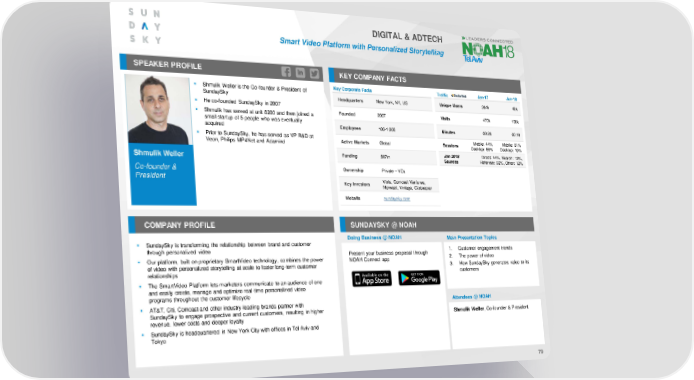 DIGITAL & ADTECH Smart Video Platform with Personalized Storytelling SPEAKER PROFILE KEY COMPANY FACTS ▪ Shmulik Weller is the Co-founder & President of Key Corporate Facts Traffic Jan-17 Jan-18 SundaySky Headquarters New York, NY, US Unique Users 364k 40k ▪ He co-founded SundaySky in 2007 ▪ Shmulik has served at unit 8200 and then joined a Founded 2007 Visits 470k 108k small startup of 5 people who was eventually acquired Employees 100-1,000 Minutes 00:26 00:16 ▪ Prior to SundaySky, he has served as VP R&D at Active Markets Global Sessions Mobile: 44% Mobile: 81% Veon, Philips MP4Net and Adamind Desktop: 56% Desktop: 19% Funding $67m Jan 2018 Direct: 44%, Search: 12%, ShmulikWeller Sources Referrals: 32%, Other: 12% Co-founder & Ownership Private – VCs President Key Investors Viola, Comcast Ventures, Norwest, Vintage, Globespan Website sundaysky.com COMPANY PROFILE SUNDAYSKY @ NOAH Doing Business @ NOAH Main Presentation Topics ▪ SundaySky is transforming the relationship between brand and customer through personalized video Present your business proposal through 1. Customer engagement trends ▪ Our platform, built on proprietary SmartVideo technology, combines the power NOAH Connect app 2. The power of video of video with personalized storytelling at scale to foster long-term customer 3. How SundaySky generates value to its relationships customers ▪ The SmartVideo Platform lets marketers communicate to an audience of one and easily create, manage and optimize real-time personalized video programs throughout the customer lifecycle ▪ AT&T, Citi, Comcast and other industry-leading brands partner with Attendees @ NOAH SundaySky to engage prospective and current customers, resulting in higher Shmulik Weller, Co-founder & President revenue, lower costs and deeper loyalty ▪ SundaySky is headquartered in New York City with offices in Tel Aviv and Tokyo 79