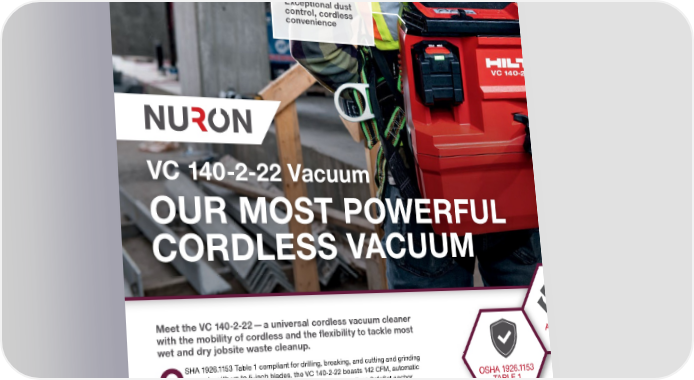 APPLICATIONS • Dust extraction from grinding, cutting, drilling and dry-coring tools • Wet and dry vacuum cleaning of construction dust, wood chippings and other jobsite waste ADVANTAGES Exceptional dust • Uncompromised cordless performance — Nuron batteries control, cordless power the high suction needed for reducing dust exposure during convenience most tasks, including drilling with hollow drill bits • Built for mobility — a compact footprint, a large handle and a weight of just 13 lbs. make this Hilti’s most agile jobsite vacuum to date • Automatic filter cleaning — helps to keep suction high and consistent without interrupting your work VC 140-2-22 Vacuum OUR MOST POWERFUL CORDLESS VACUUM Meet the VC 140-2-22 — a universal cordless vacuum cleaner with the mobility of cordless and the flexibility to tackle most APPROVED wet and dry jobsite waste cleanup. SHA 1926.1153 Table 1 compliant for drilling, breaking, and cutting and grinding concrete with up to 5-inch blades, the VC 140-2-22 boasts 142 CFM, automatic OSHA 1926.1153 Ofilter cleaning, and 2-gal. capacity. And it’s the only cordless SafeSet anchor installation system for the ultimate in anchoring productivity. TABLE 1 COMPLIANT Its slim and lightweight design offers ideal ergonomics, allowing you to carry it more comfortably. Paired with the detachable backpack, you can carry it hands-free and better control dust anywhere on the jobsite. For even more convenience, the vac is equipped with remote on/off functionality via a retrofittable Bluetooth module. Between the Nuron-powered VC 140-2-22 and the soon-to- launch VC 75-1-22, Hilti has 21 75$&. <($5 <($5 '$< /,0,7(' :($5$1'7($5 5(3$,5 $66(7 722/)/((7 :$55$17< &29(5$*( 7851$5281' 0$1$*(0(17 0$1$*(0(17 your dust control covered. CLICK TO LEARN MORE