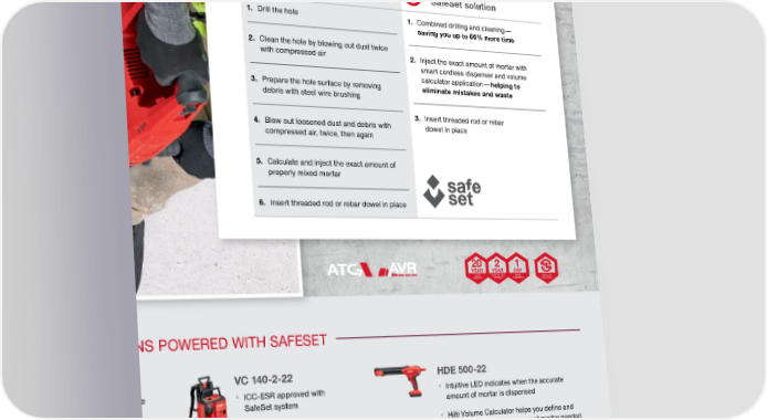 OUT WITH THE OLD, IN WITH THE NEW Conventional Nuron-powered WORLD’S FIRST installation SafeSet solution 1. Drill the hole 1. Combined drilling and cleaning — saving you up to 60% more time 2. Clean the hole by blowing out dust twice CORDLESS with compressed air 2. Inject the exact amount of mortar with smart cordless dispenser and volume calculator application — helping to 3. Prepare the hole surface by removing eliminate mistakes and waste SAFESET debris with steel wire brushing 3. Insert threaded rod or rebar 4. Blow out loosened dust and debris with dowel in place SYSTEM compressed air, twice, then again 5. Calculate and inject the exact amount of properly mixed mortar 6. Insert threaded rod or rebar dowel in place <($5 <($5 '$< /,0,7(' :($5$1'7($5 5(3$,5 TOOL FLEET :$55$17< &29(5$*( 7851$5281' MANAGEMENT Tackle the most demanding OUTPERFORMING INNOVATIONS POWERED WITH SAFESET anchor applications with the world’s first fully cordless SafeSet system, powered by Nuron. TE 60-22 VC 140-2-22 HDE 500-22 ombining hole drilling and cleaning with • Up to double the work per charge• ICC-ESR approved with • Intuitive LED indicates when the accurate guess-free adhesive injection, SafeSet makes SafeSet system amount of mortar is dispensed Canchor installation faster, easier, and safer. • Active Torque Control (ATC) better protects you from uncontrolled • OSHA 1926.1153 Table 1 • Hilti Volume Calculator helps you define and Drill faster and run longer with the top-performing, low-rotation of the toolcompliant with HEPA filter dispense the correct dosage of mortar needed weight TE 60-22 combihammer, clean the hole as you drill with the VC 140-2-22 cordless vacuum cleaner, and take • Active Vibration Reduction (AVR) • Bluetooth (BLE) enabled • Smart discard function makes properly mixed the guesswork out of proper mortar injection from discard helps add comfort against vibrationfeatures for even easier handling ratio of two-part mortar correctly, regardless of to dosing with the HDE 500-22 smart cordless dispenser adhesive or tube size and volume calculator—all on one battery platform. CLICK TO LEARN MORE