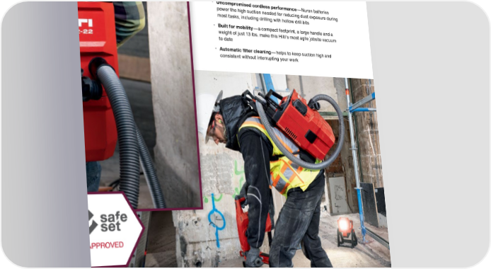 APPLICATIONS • Dust extraction from grinding, cutting, drilling and dry-coring tools • Wet and dry vacuum cleaning of construction dust, wood chippings and other jobsite waste ADVANTAGES Exceptional dust • Uncompromised cordless performance — Nuron batteries control, cordless power the high suction needed for reducing dust exposure during convenience most tasks, including drilling with hollow drill bits • Built for mobility — a compact footprint, a large handle and a weight of just 13 lbs. make this Hilti’s most agile jobsite vacuum to date • Automatic filter cleaning — helps to keep suction high and consistent without interrupting your work VC 140-2-22 Vacuum OUR MOST POWERFUL CORDLESS VACUUM Meet the VC 140-2-22 — a universal cordless vacuum cleaner with the mobility of cordless and the flexibility to tackle most APPROVED wet and dry jobsite waste cleanup. SHA 1926.1153 Table 1 compliant for drilling, breaking, and cutting and grinding concrete with up to 5-inch blades, the VC 140-2-22 boasts 142 CFM, automatic OSHA 1926.1153 Ofilter cleaning, and 2-gal. capacity. And it’s the only cordless SafeSet anchor installation system for the ultimate in anchoring productivity. TABLE 1 COMPLIANT Its slim and lightweight design offers ideal ergonomics, allowing you to carry it more comfortably. Paired with the detachable backpack, you can carry it hands-free and better control dust anywhere on the jobsite. For even more convenience, the vac is equipped with remote on/off functionality via a retrofittable Bluetooth module. Between the Nuron-powered VC 140-2-22 and the soon-to- launch VC 75-1-22, Hilti has 21 75$&. <($5<($5'$< /,0,7(':($5$1'7($55(3$,5 $66(7722/)/((7 :$55$17<&29(5$*(7851$5281' 0$1$*(0(170$1$*(0(17 your dust control covered. CLICK TO LEARN MORE