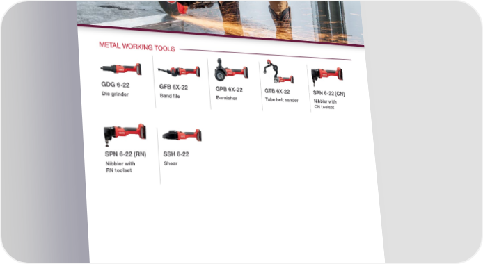 CORDLESS SAWS, GRINDERS AND METAL WORKING TOOLS CUT-OFF SAWSSAWSMETAL WORKING TOOLS COMING COMING SOONSOON DSH 600-22DWP 15-22SC 4 WL-22SC 30 WL-22SC 30 WR-22GDG 6-22 GFB 6X-22GPB 6X-22 GTB 6X-22 SPN 6-22 (CN) Water pumpWood cutting circular Wood cutting circular Wood cutting circular Die grinderBand fileBurnisherTube belt sanderNibbler with Cut-off saw CN toolset saw (6.5") blade leftsaw (7.25") blade leftsaw (7.25") blade right COMING SOON SPN 6-22 (RN) SSH 6-22 SC 5ML-22SB 4-22SJD 6-22SJT 6-22SR 4-22Nibbler with Shear Metal cutting Compact band Jigsaw D handleJigsaw T handleOne-handed RN toolset circular saw (6.5") saw (2.5")reciprocating saw blade left SR 6-22SCO 6-22 Reciprocating sawCutout tool GRINDERS AG 4-22 (4.5")AG 4-22 (5")AG 5D-22 (5")AG 6D-22 (5")AG 6D-22 (6") 4.5" Angle grinder5" Angle grinder5" Angle grinder5" Angle grinder 6" Angle grinder w/ SensTechw/ SensTech