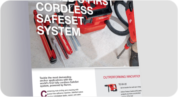OUT WITH THE OLD, IN WITH THE NEW Conventional Nuron-powered WORLD’S FIRST installation SafeSet solution 1. Drill the hole 1. Combined drilling and cleaning — saving you up to 60% more time 2. Clean the hole by blowing out dust twice CORDLESS with compressed air 2. Inject the exact amount of mortar with smart cordless dispenser and volume calculator application — helping to 3. Prepare the hole surface by removing eliminate mistakes and waste SAFESET debris with steel wire brushing 3. Insert threaded rod or rebar 4. Blow out loosened dust and debris with dowel in place SYSTEM compressed air, twice, then again 5. Calculate and inject the exact amount of properly mixed mortar 6. Insert threaded rod or rebar dowel in place <($5 <($5 '$< /,0,7(' :($5$1'7($5 5(3$,5 TOOL FLEET :$55$17< &29(5$*( 7851$5281' MANAGEMENT Tackle the most demanding OUTPERFORMING INNOVATIONS POWERED WITH SAFESET anchor applications with the world’s first fully cordless SafeSet system, powered by Nuron. TE 60-22 VC 140-2-22 HDE 500-22 ombining hole drilling and cleaning with • Up to double the work per charge • ICC-ESR approved with • Intuitive LED indicates when the accurate guess-free adhesive injection, SafeSet makes SafeSet system amount of mortar is dispensed Canchor installation faster, easier, and safer. • Active Torque Control (ATC) better protects you from uncontrolled • OSHA 1926.1153 Table 1 • Hilti Volume Calculator helps you define and Drill faster and run longer with the top-performing, low- rotation of the tool compliant with HEPA filter dispense the correct dosage of mortar needed weight TE 60-22 combihammer, clean the hole as you drill with the VC 140-2-22 cordless vacuum cleaner, and take • Active Vibration Reduction (AVR) • Bluetooth (BLE) enabled • Smart discard function makes properly mixed the guesswork out of proper mortar injection from discard helps add comfort against vibration features for even easier handling ratio of two-part mortar correctly, regardless of to dosing with the HDE 500-22 smart cordless dispenser adhesive or tube size and volume calculator—all on one battery platform. CLICK TO LEARN MORE