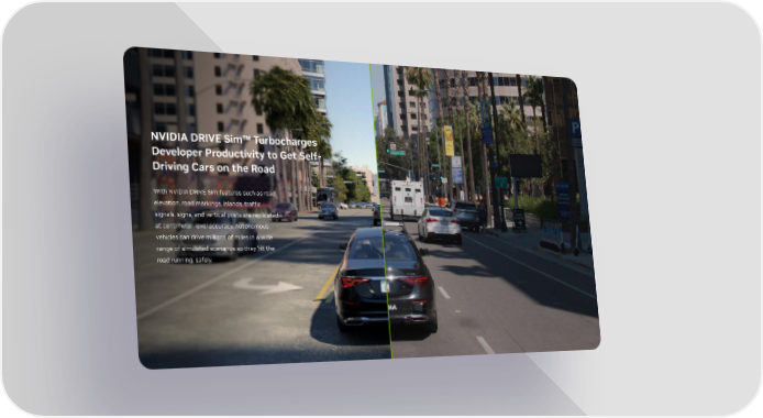 NVIDIA DRIVE Simâ„¢Turbocharges Developer Productivity to Get Self- Driving Cars on the Road With NVIDIA DRIVE Sim features such as road elevation, road markings, islands, traffic signals, signs, and vertical posts are replicated at centimeter-level accuracy. Autonomous vehicles can drive millions of miles in a wide range of simulated scenarios so they hit the road running, safely.