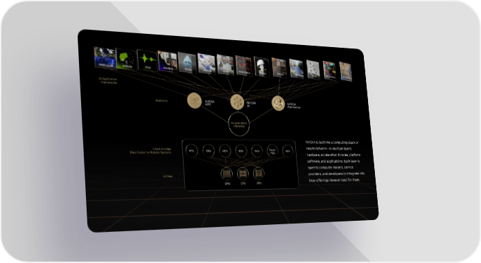 AI Application Frameworks Platforms NVIDIA NVIDIA NVIDIA HPC AI Omniverse Acceleration Libraries NVIDIA is built like a computing stack or Cloud-to-Edge Super neural network—in multiple layers: Data Center-to-Robotic Systems RTX DGX HGX EGX OVX POD AGX hardware, acceleration libraries, platform software, and applications. Each layer is open to computer makers, service 3Chips providers, and developers to integrate into GPU CPU DPU their offerings however best for them.