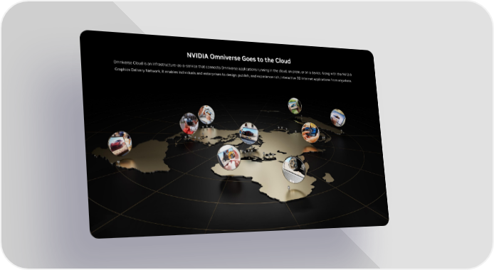 NVIDIA Omniverse Goes to the Cloud Omniverse Cloud is an infrastructure-as-a-service that connects Omniverse applications running in the cloud, on prem, or on a device. Along with the NVIDIA Graphics Delivery Network, it enables individuals and enterprises to design, publish, and experience rich, interactive 3D internet applications from anywhere.