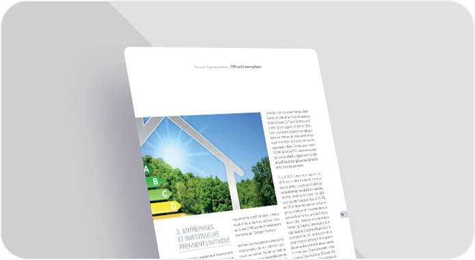 Focus sur 8 grands secteurs - Efficacité énergétique Le fonds multi-corporate français, Aster Capital, profite de la troisième levée de fonds du texan EnTouch Controls pour entrer à son capital en février 2016. Celui-ci améliore la gestion énergétique dans les chaînes de restaurants et les supermarchés. Quelques semaines auparavant, Aster Capital avait investi 1,3 M€ dans Eco GTB, une jeune pousse parisienne cette fois, également orientée vers l’efficacité énergétique des bâtiments et de leurs équipements. D’ici à 2019, Engie veut majorer de 40 % son chiffre d’affaires mondial dans le secteur. Le groupe procède par rachat d’entreprises déjà bien installées, comme l’américaine Ecova en 2014 ou la société française Nexilis (74 M€ de CA) en décembre dernier, active en mouvements on/off de base : c’est la génie climatique et implantée dans le 3. ENTREPRISES solution de la start-up iséroise Irlynx, sud-est de la France. La filiale Cofely a, ET INVESTISSEURS qui a levé 2 M€ auprès d’investisseurs de son côté, investi en minoritaire dans 73 PRENNENT L’INITIATIVE emmenés par Demeter Partners. Partnering Robotics, développeur d’un robot baptisé Diya One efficace pour la Informer les employés de bureau sur la purification de l’air, la réduction de la Sur le terrain, on observe un foisonnement consommation de leur bâtiment pour consommation d’énergie et la gestion d’initiatives et d’annonces stimulées par la mieux les motiver, tel est le credo de des demandes d’entretien des occupants COP21, alors que le modèle économique de iQSpot, une jeune pousse bordelaise née d’immeubles. Et aux antipodes, Engie l’efficacité énergétique demeure incertain en janvier 2015 qui a engrangé 300 K€ a acquis Desa Australia (340 salariés), et que le retour sur investissement recule dès octobre. Ses capteurs mesurent les dédiée à l’installation de systèmes de en proportion de la baisse du prix des consommations d’électricité, de gaz et communication et de câblages électriques énergies fossiles. d’eau. S’y ajoute l’évaluation du confort, dans les supermarchés, les banques indiqué par les taux de CO2, d’humidité, et les data centers mais de plus en 3.1 Collecter et interpréter les de température et le bruit. Les données plus orientée vers la réduction des données s’affichent sur l’ordinateur ou le téléphone consommations chez ses clients. des collaborateurs. Plateforme logicielle de données d’usage 3.3 L’attraction de la chaleur dédiée au logement collectif, Intent 3.2 Investir dans les services fatale Technologies a fait entrer quatre nouveaux énergétiques actionnaires à son capital, en collectant La jeune pousse parisienne Defab qui 3 M€. Parmi eux, trois fonds corporate Lancé début 2015, le fonds Demeter récupère la chaleur produite par les data d’industriels majeurs : Suez Ventures pour 4 Infra a réservé sa première mise centers pour produire de l’eau chaude Suez, BIRD pour Bouygues Immobilier de fonds à l’efficacité énergétique, en pour les bâtiments a été lauréate de la et Build up pour Bouygues Construction, e achetant 81 % d’une société de projet 2 édition de l’IE-Club Global 60, ex-aequo auxquels s’ajoute Nord Capital Partenaires. d’Eiffage, attributaire d’un important dans la catégorie cleantech avec Enertime. contrat de performance énergétique Son chauffe-eau thermodynamique est Des capteurs infrarouges révélant la (CPE) remporté en 2010. Ce CPE de la un data center qui relargue l’énergie présence humaine et la caractérisant, région Centre porte sur la rénovation de fournie par le stockage et traitement en lieu et place des détecteurs de 18 lycées et bâtiments administratifs. des données. La start-up partage une Panorama des Cleantech 2016