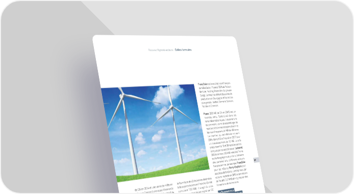 Focus sur 8 grands secteurs - Eolien terrestre FrancEole est le seul fabricant français de mâts d’acier. Filiale à 100 % de Pelican Venture, holding financière du groupe Gorgé, l’entreprise détient deux sites de production en Bourgogne et fournit les plus grands : Vestas, Siemens, Senvion, Nordex et Enercon. Poma (283 M€ de CA en 2013) est un nouveau venu. Spécialisé dans les remontées mécaniques, il va construire sa première usine d’assemblage de nacelles d’éoliennes et espère devenir le fabricant français multi-MW de référence. Le chantier, qui doit débuter en avril 2016, devrait être finalisé en 2017 pour un investissement de 15 M€. Le site produira entre 10 et 20 nacelles par an, conçues par sa société soeur, Leitwind (300 éoliennes, 400 MW installés). Poma souhaite agréger autour de lui, à travers des partenariats, différents acteurs français comme, par exemple, FrancEole 37 pour les mâts ou Ferry-Capitain pour les pièces de fonderie. L’entreprise a, par de CA en 2014 et une usine de mâts en la fourniture de 43 éoliennes destinées ailleurs, racheté en 2015 le parc éolien béton en France d’une capacité annuelle à deux parcs éoliens en Franche-Comté de Pellafol (2,7 MW) afin d’y réaliser des de 100 unités), et Senvion (2,14 Mds€ de cumulant 120 MW. Il s’agit du plus formations de techniciens. CA en 2015). Nordex a fait une percée important contrat éolien signé par GE en 2015 en atteignant 19 % de part de en France. 2.2 De nombreux marché, contre 4 % en 2014. Son modèle développeurs-exploitants N100 s’est imposé comme le plus installé Le pionnier de la fabrication d’éoliennes en France l’année dernière. en France, Vergnet, au bord de la faillite Engie est le premier exploitant éolien en 2012, va mieux. Son changement de de France, avec 1 533 MW répartis Le tissu industriel français est surtout stratégie et sa restructuration ont permis sur 143 parcs gérés par ses filiales et composé de PME sous-traitantes plus de redresser la barre (lire encadré) participations (GDF Suez Futures Énergies, ou moins spécialisées, issues d’univers La Compagnie du Vent, la Compagnie très divers. Placé en redressement judiciaire fin 2012, nationale du Rhône et Maïa Eolis qu’il Alizeo, fabricant d’éoliennes rabattables détient à 100 % depuis mars 2016). Le Les industriels français font pâle figure, pour les zones cycloniques, ressuscite groupe prévoit la mise en service de et sa tête de file Alstom a été absorbée partiellement. Net-Wind, spécialisée 640 MW d’ici à 2018. par General Electric (GE) en 2015. Le dans la maintenance (1,6 M€ de CA nouvel ensemble pèse 6,3 Mds€ de CA en 2014), a racheté 6 brevets et une EDF EN (1,14 Md€ de CA en 2015) opérait dans l’éolien et annonce plus de 30 000 partie de ses actifs. Fondée en 2011, 75 parcs éoliens en France au 1er janvier machines installées dans le monde. GE a la PME emploie environ 50 personnes, 2016, cumulant 1 040 MW de capacité décidé de créer un nouveau pôle industriel réparties au sein de quatre agences installée. Le groupe prévoit la mise en dédié aux énergies renouvelables, basé régionales. Une dizaine sont affectées service de l’Ensemble Eolien Catalan en France et piloté par Jérôme Pécresse, au département « ingénierie », issu de la (96 MW), dans les Pyrénées-Orientales, président d’Alstom Renewable Power. Fin reprise, en 2014, de l’activité « éoliennes à l’été 2016. 2015, GE Renewable Energy a annoncé terrestres » d’Areva. Panorama des Cleantech 2016