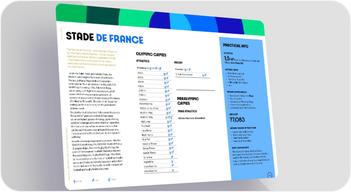 4 2 0 S 2 I PRACTICAL INFO R A STADE DE FRANCE P LOCATION The Stade de France – the Olympic Stadium OLYMPIC GAMES 1,5 KM from the Olympic and Paralympic for the Paris 2024 Games – is the largest Village, Saint-Denis (93) stadium in France. Since it opened in 1998, ATHLETICS RUGBY it has been the focal point of all major national and international sporting events 43 events: 21 / 21 / 1 2 events: 1 / 1 GETTING THERE held in France. • Metro lines 13 and 14 100 m / 12-team tournament / • RER lines B and D Located in Saint-Denis, just outside Paris, the 200 m / • Tramlines T1 and T8 stadium was designed by a team of architects – • Vélib’ public bike stations Macary, Zublena, Regembal and Costantini – 400 m / • Bus to be used as the main stadium for the 1998 FIFA 800 m / World Cup. Covering 17 ha, this 320 m long, 1 500 m / NEARBY GAMES VENUES 280 m wide, 35 m high modular stadium, which • Olympic and Paralympic Village boasts 18 electronic entrance gates and can 5 000 m / accommodate up to 80,000 spectators, is the largest 10 000 m / PARALYMPIC • Aquatics Centre of its kind in the world. The retractable lower-tier GAMES • La Courneuve Shooting Range seating can be moved to reveal the permanent 400 m hurdles / • Porte de la Chapelle Arena athletics track. 3000 m steeplechase / • Le Bourget Sport Climbing Venue The stadium’s elliptical roof fully covers the stands. 4x100 m relay / PARA ATHLETICS The 8,000 m² sand-and-soil pitch harnesses CAPACITY advanced hybrid grass technology, guaranteeing 4x400 m relay / / Information to be determined excellent drainage and water retention capacities. High jump / 77,083 T The Stade de France has an annex stadium that Pole Vault / E can be used for warm-ups and practice sessions. E Long Jump / NEARBY TOURIST ATTRACTIONS H It is connected to the stadium via an underground A S • Sacré-Cœur Basilica (Paris) T walkway. Triple Jump / A • Montmartre area (Paris) S : D As well as hosting major sporting events – like the Shot Put / • Saint-Denis Basilica E U 1998 FIFA World Cup, the 2003 IAAF World Athletics Hammer Throw / • Saint-Ouen flea market N E Championships, the 2007 Rugby World Cup, the C V Discus Throw / I 2016 UEFA European Football Championship and POST-2024 LEGACY P M the upcoming 2023 Rugby World Cup – the Stade Javelin Throw / Y The Stade de France, which will have L A de France is home to the French football and rugby Decathlon R undergone development and modernisation A teams and hosts concerts by top name artists from D P France and around the world, as well as important Heptathlon work for the Games, will continue to host N major international sporting competitions, as C A football and rugby finals every year. 110 m hurdles I well as cultural events and concerts. P 100 m hurdles M Y L O women men mixed 43