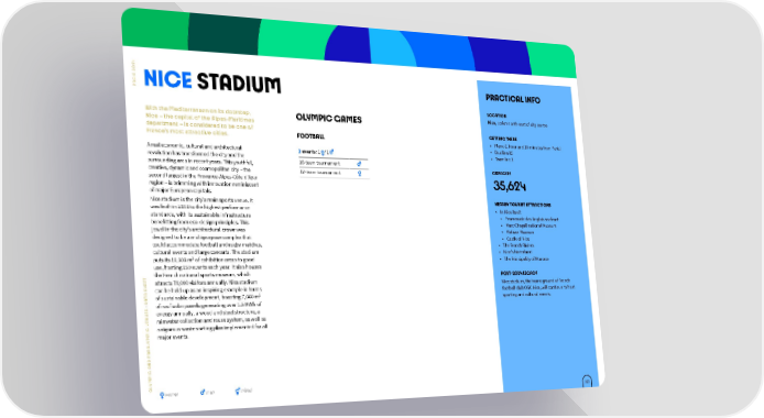 4 2 0 S 2 I PRACTICAL INFO R A NICE STADIUM P LOCATION With the Mediterranean on its doorstep, OLYMPIC GAMES Nice, 10 km north-east of city centre Nice – the capital of the Alpes-Maritimes department – is considered to be one of GETTING THERE France’s most attractive cities. FOOTBALL • Plane (1 hour and 10 minutes from Paris) • Bus line 95 A real economic, cultural and architectural 2 events: 1 / 1 • Tramline 3 revolution has transformed the city and the 16-team tournament surrounding area in recent years. This youthful, CAPACITY creative, dynamic and cosmopolitan city – the 12-team tournament second largest in the Provence-Alpes-Côte d’Azur 35,624 region – is brimming with innovation reminiscent of major European capitals. Nice stadium is the city’s main sports venue. It NEARBY TOURIST ATTRACTIONS was built in 2013 to the highest performance • In Nice itself: standards, with its sustainable infrastructure • Promenade des Anglais seafront benefitting from eco-design principles. This • Marc Chagall national Museum jewel in the city’s architectural crown was • Matisse Museum designed to be a multipurpose complex that • Castle of Nice could accommodate football and rugby matches, • The French Riviera cultural events and large concerts. The stadium • Nice’s hinterland puts its 10,000 m² of exhibition areas to good • The Principality of Monaco use, hosting 150 events each year. It also houses T the French national sports museum, which POST-2024 LEGACY E attracts 70,000 visitors annually. Nice stadium E Nice stadium, the home ground of French H can be held up as an inspiring example in terms A S football club OGC Nice, will continue to host T of sustainable development, boasting 7,000 m² A sporting and cultural events. S : D of roof solar panels generating over 1.5 MWh of E energy annually, a wood and steel structure, a U N E rainwater collection and reuse system, as well as C V a rigorous waste sorting plan implemented for all I P major events. M Y L A R A D P N C A I P M Y L O women men mixed 50
