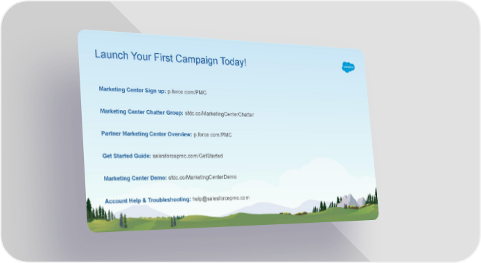 Launch Your First Campaign Today! Marketing Center Sign up: p.force.com/PMC Marketing Center Chatter Group: sfdc.co/MarketingCenterChatter Partner Marketing Center Overview: p.force.com/PMC Get Started Guide: salesforcepmc.com/GetStarted Marketing Center Demo: sfdc.co/MarketingCenterDemo Account Help & Troubleshooting: [email protected]