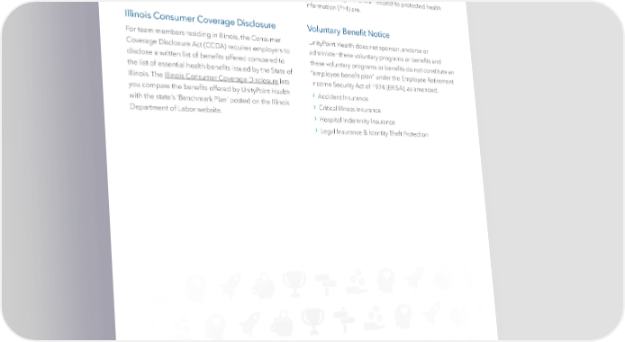 Marketplace Notice Notice of Privacy Practices The Patient Protection and Affordable Care Act (ACA) The HIPAA Privacy Rule requires groups offering certain requires employers to provide team members with a health bene昀椀t plans to develop and distribute a Notice written notice informing them of the existence of the of Privacy Practices (NPPs). The Notice of Privacy Practices Marketplace, including a description of the services must describe how the covered entity may and may not provided by the Marketplace. The Marketplace Notice use protected health information (PHI) and what your also lets you know how you may contact the Marketplace rights and obligations with respect to protected health to request assistance. information (PHI) are. Illinois Consumer Coverage Disclosure Voluntary Bene昀椀t Notice For team members residing in Illinois, the Consumer UnityPoint Health does not sponsor, endorse or Coverage Disclosure Act (CCDA) requires employers to administer these voluntary programs or bene昀椀ts and disclose a written list of bene昀椀ts offered compared to these voluntary programs or bene昀椀ts do not constitute an the list of essential health bene昀椀ts issued by the State of “employee bene昀椀t plan” under the Employee Retirement Illinois. The Illinois Consumer Coverage Disclosure lets Income Security Act of 1974 (ERISA), as amended. you compare the bene昀椀ts offered by UnityPoint Health › Accident Insurance with the state’s ‘Benchmark Plan’ posted on the Illinois › Critical Illness Insurance Department of Labor website. › Hospital Indemnity Insurance › L egal Insurance & Identity Theft Protection | 51 |