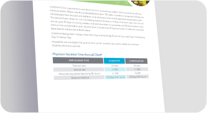 Vacation Time UnityPoint Clinic supports time away from the clinic by providing vacation time in accordance with the schedule below. Please note this is adjusted based upon FTE status. In addition, recognized holidays are not deducted from the bank and sick time is not deducted when on the approved compensation plan. The standard plan allows for non hospitalist physicians to receive 10 days of vacation upon hire. You will accrue up to 20 days (including vacation and sick time) when on guarantee and 30 days (vacation only) when on the compensation plan. Vacation time includes time off required under all state and local paid leave laws to include sick and safe leave. UnityPoint Recognized Holidays: New Year’s Day, Memorial Day, Fourth of July, Labor Day, Thanksgiving Day, Christmas Day. Hospitalists are not eligible for vacation time but do receive 5 days paid to satisfy the short term disability elimination period. Physician Vacation Time Accrual Chart* EMPLOYMENT TYPE GUARANTEE COMPENSATION Days per year 20 days 30 days Accrual rate 7.70% 11.54% Hours per pay period (assuming 80 hours) 6.1538 9.2308 Maximum balance 20 Days (160 Hours) 30 Days (240 Hours) | 37 |