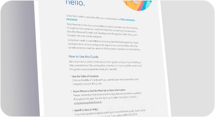 hello. UnityPoint Health is proud to offer you a comprehensive TOTAL REWARDS . PROGRAM Total Rewards is the value provided to our team members and their families throughout their career at UnityPoint Health by combining Compensation, Bene昀椀ts, Personal Growth and Development, Recognition, Well-Being, and Purpose into one, simple program. UnityPoint Health is committed to providing bene昀椀ts that support our team members from various backgrounds, experiences, and identities. We offer bene昀椀ts aimed to meet the needs of all of our team members and their families. How to Use this Guide We know there is a lot of information in this guide, and you may be feeling a little overwhelmed. We put together a few tips for how to get the most out of this guide as you prepare to select your bene昀椀ts. › Use the Table of Contents Click on the title of the bene昀椀t you want to learn more about for quick navigation around the guide. › Know Where to Get the Most Up to Date Information Please remember that these enrollment guides are sometimes updated throughout the year. For the most up to date information, head to unitypoint.org/totalrewards. › AskHR is Here to Help! If you have questions about anything in the enrollment guide, reach out to AskHR by creating a case in Lawson or by calling (888) 543-2275. | 1 |