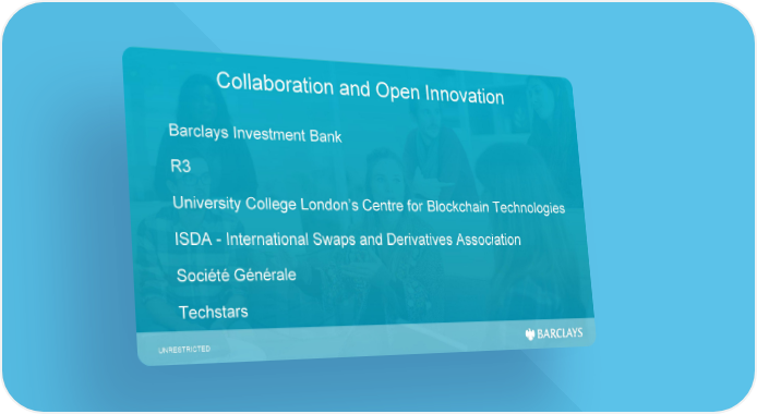 Collaboration and Open Innovation Barclays Investment Bank R3 University College London’s Centre for Blockchain Technologies ISDA - International Swaps and Derivatives Association Société Générale Techstars UNRESTRICTED