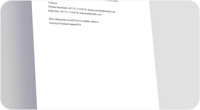 The Photo with the index number 16A843 is available online at: Page 4 www.media.daimler.com Caption 16A843: Mercedes-Benz Vans starts startup partnership challenge "Startup adVANce" Contacts: Thomas Rosenthal, +49 711 17-4 02 86, [email protected] Katja Bott, +49 711 17-8 40 20, [email protected] More information on adVANce is available online at: www.d.ai/VanInnoCampus2016 Daimler Communications, 70546 Stuttgart, Germany Mercedes-Benz – A Daimler Brand