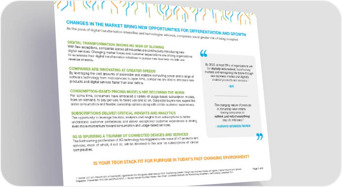 CHANGES IN THE MARKET BRING NEW OPPORTUNITIES FOR DIFFERENTIATION AND GROWTH As the pace of digital transformation intensifies and technologies advance, companies are at greater risk of being disrupted. DIGITAL TRANSFORMATION SHOWS NO SIGN OF SLOWING With few exceptions, companies across all industries are continuously introducing new digital services. Changing market forces and customer expectations are driving organizations to accelerate their digital transformation initiatives to pursue new business models and By 2020, at least 55% of organizations will revenue streams. be digitally determined, transforming COMPANIES ARE INNOVATING AT GREATER SPEEDS markets and reimagining the future through By leveraging the vast amounts of accessible and scalable computing power and a range of new business models and digitally 1 software technology from microservices to open APIs, companies are able to introduce new enabled products and services. products and digital services faster than ever before. - IDC CONSUMPTION-BASED PRICING MODELS ARE BECOMING THE NORM For some time, consumers have embraced a variety of usage-based subscription models, from on-demand, to pay-per-use, to tiered use and so on. Corporate buyers now expect the same consumption and flexible ownership options along with similar customer experiences. The changing nature of products is disrupting value chains, SUBSCRIPTIONS DELIVER CRITICAL INSIGHTS AND ANALYTICS forcing companies to The opportunity to leverage the data, analytics and insights from subscriptions to better rethink and retool everything understand customer preferences and deliver exceptional customer experiences is driving they do internally.2 even more momentum toward consumption and usage-based services. - HARVARD BUSINESS REVIEW 5G IS SPURRING A TSUNAMI OF CONNECTED DEVICES AND SERVICES The forthcoming proliferation of 5G technology has triggered a new wave of loT products and services, most of which, if not all, will be delivered to the user via subscriptions of various complexities. IS YOUR TECH STACK FIT FOR PURPOSE IN TODAY’S FAST CHANGING ENVIRONMENT? 1. Source: IDC: IDC Predicts 55% of Asia/Pacific Organizations Will Be Digitally Determined by 2020, Transforming Markets Through New Business Models and Digitally Enabled Products and Services, Page 1 of 6 Singapore, 2 November 2018, Doc #prAP44426218 , 2. Source: Harvard Business Review: How Smart, Connected Products Are Transforming Competition, North America, November 2014