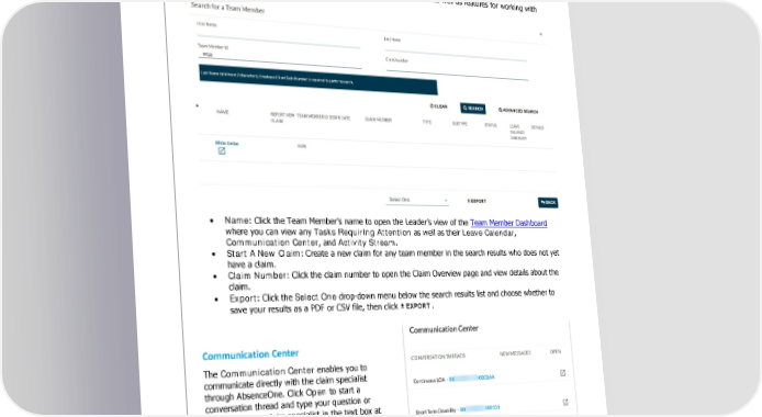 for Disability and Leave of Absence Claims Search Results The search results provide information about claims matching your criteria as well as features for working with those claims directly. • Name: Click the Team Member’s name to open the Leader’s view of the Team Member Dashboard where you can view any Tasks Requiring Attention as well as their Leave Calendar, Communication Center, and Activity Stream. • Start A New Claim: Create a new claim for any team member in the search results who does not yet have a claim. • Claim Number: Click the claim number to open the Claim Overview page and view details about the claim. • Export: Click the Select One drop-down menu below the search results list and choose whether to save your results as a PDF or CSV file, then click . Communication Center The Communication Center enables you to communicate directly with the claim specialist through AbsenceOne. Click Open to start a conversation thread and type your question or message to the claim specialist in the text box at the bottom of the section. The claim specialist will be notified of the message and should respond within one business day. Sedgwick Copyright © 2019 The information contained herein is confidential and proprietary to Sedgwick. Last Updated March 21, 2019 -5-