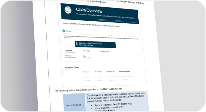 for Disability and Leave of Absence Claims Claim Overview The Claim Overview page contains all the information relevant to a claim. You can open this page by clicking any blue claim number on your dashboard or My Claims page. The following helpful features are available on the Claim Overview page: Click this option in the page header to choose from additional tools. The list varies by type of claim and your role (as Team Member or Leader) but may include the following: I would like to... • Return to Search Results (Leader only) • View Documents and Forms • Upload Documents Select Claim Click this option in the page header if you have multiple claims and would like to view another claim's details. Expand to view additional details. Collapse to hide additional details. 4 Sedgwick Copyright © 2020 The information contained herein is confidential and proprietary to Sedgwick. Last Updated December 1, 2020
