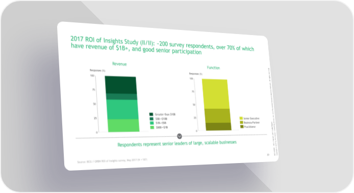 2017 ROI of Insights Study (II/II): ~200 survey respondents, over 70% of which have revenue of $1B+, and good senior participation . d e Revenue Function v r e s e r s Responses (%) Responses (%) t h g i r l l 100 100 A . k r o w t e N s s e n i 75 75 s u B ch r a e s e R l a b 50 50 o l G e Th d n a Greater than $10B c. n I 25 25 $5B-<$10B Senior Executive , p u o t r $1B-<$5B Business Partner r G o p g e n i R t $500-<$1B Practitioner l y u d s u n 0 0 t Co S 7 n 1 o 0 t 2 s o t B ghe i s Th In y Respondents represent senior leaders of large, scalable businesses f b o 7 OI 1 R 0 2 - © N B t h g i GRr G y C p Source: BCG / GRBN ROI of Insights survey, May 2017 (N = 187) 20 B Co