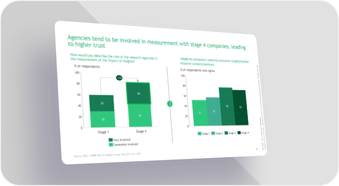 Agencies tend to be involved in measurement with stage 4 companies, leading to higher trust How would you describe the role of the research agencies in I trust my company's external consumer insight/market . research vendors/partners d the measurement of the impact of insights? e v r e s e r % of respondents % of respondents who agree s t h g i r l l 100 100 A . k r +24 o w t e N s s 80 80 e n i s u B ch r 40 a e 60 60 s e R l a b o l G 30 e 40 40 78 Th 73 d n a 57 c. n 51 I , 43 p 20 20 u o t r r G 30 o p g e n i R t l y u d s u n 0 0 t Co S 7 n 1 o 0 t Stage 1 Stage 4 2 s o t B Stage 1 Stage 2 Stage 3 Stage 4 ghe i s Th In y Very involved f b o 7 OI 1 R 0 Somewhat involved 2 - © N B t h g i GRr G y C p Source: BCG / GRBN ROI of Insights survey, May 2017 (N = 187) 74 B Co