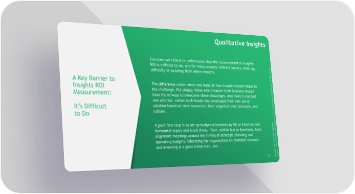 Qualitative Insights Everyone we talked to understands that the measurement of Insights . d ROI is difficult to do, and for many reasons: Indirect impact, time lag, e v r e s e r difficulty in isolating from other impacts. s t h g i r l l A . k A Key Barrier to r o w The difference comes when one looks at how Insights leaders react to t e N Insights ROI s s e the challenge. Put simply, those who measure their business impact n i s u B Measurement: have found ways to overcome these challenges. And there is not just ch r a e s one solution, rather each leader has developed their own set of e R l a b o solution based on their resources, their organizational structure, and l G It’s Difficult e Th culture. d n a to Do c. n I , p u o t r r G o A good first step is to set up budget allocations by BU or function and p g e n i R t l y u d s horizontal topics and track them. Then, within BUs or functions, have u n t Co S 7 n 1 o 0 t alignment meetings around the timing of strategic planning and 2 s o t B ghe i operating budgets. Educating the organization on thematic research s Th In y f b o 7 and investing is a good initial step, too. OI 1 R 0 2 - © N B t h g i GRr G y C p 37 B Co