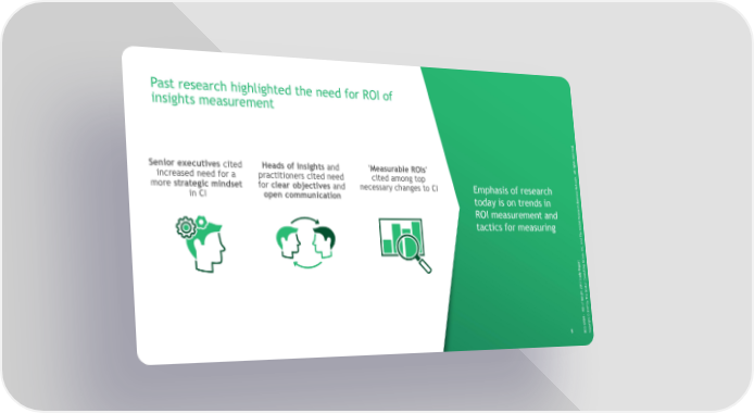 Past research highlighted the need for ROI of insights measurement . d e v r e s e r s t h g i r l l A Senior executives cited Heads of insights and 'Measurable ROIs' . k r o increased need for a practitioners cited need cited among top w t e N s more strategic mindset for clear objectives and necessary changes to CI Emphasis of research s e n i s in CI open communication u B today is on trends in ch r a e s ROI measurement and e R l a b o l tactics for measuring G e Th d n a c. n I , p u o t r r G o p g e n i R t l y u d s u n t Co S 7 n 1 o 0 t 2 s o t B ghe i s Th In y f b o 7 OI 1 R 0 2 - © N B t h g i GRr G y C p 8 B Co