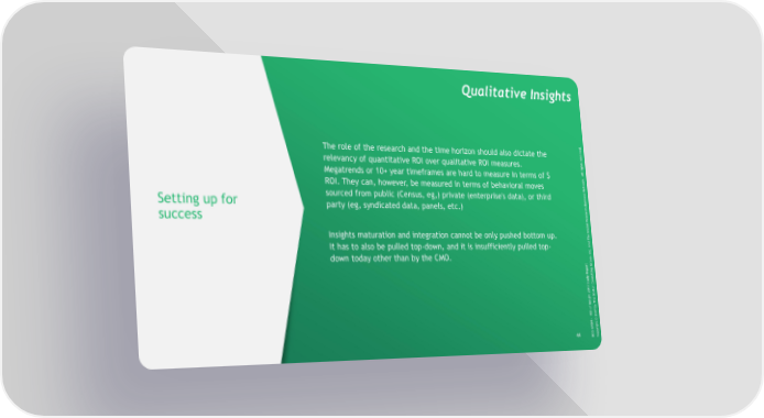 Qualitative Insights . d e v r e The role of the research and the time horizon should also dictate the s e r s t relevancy of quantitative ROI over qualitative ROI measures. h g i r l l A Megatrends or 10+ year timeframes are hard to measure in terms of $ . k r o w ROI. They can, however, be measured in terms of behavioral moves t e N s s e sourced from public (Census, eg,) private (enterprise's data), or third n i s u B Setting up for party (eg, syndicated data, panels, etc.) ch r a e s e success R l a b o l G Insights maturation and integration cannot be only pushed bottom up. e Th d n a It has to also be pulled top-down, and it is insufficiently pulled top- c. n I , down today other than by the CMO. p u o t r r G o p g e n i R t l y u d s u n t Co S 7 n 1 o 0 t 2 s o t B ghe i s Th In y f b o 7 OI 1 R 0 2 - © N B t h g i GRr G y C p 44 B Co