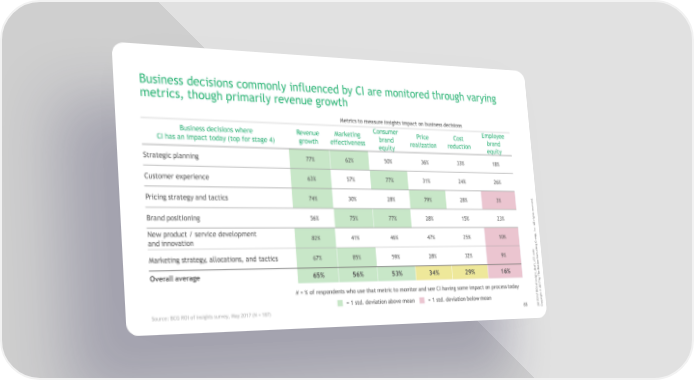 Business decisions commonly influenced by CI are monitored through varying metrics, though primarily revenue growth Metrics to measure insights impact on businessdecisions Business decisions where Revenue Marketing Consumer Price Cost Employee CI has an impact today (top for stage 4) growth effectiveness brand realization reduction brand equity equity Strategic planning 77% 62% 50% 36% 33% 18% Customer experience 63% 57% 77% 31% 24% 26% . Pricing strategy and tactics 74% 30% 28% 79% 28% 3% d ve r e s e r s t h ig Brand positioning 56% 75% 77% 28% 15% 23% r l Al . c n New product / service development I p, 82% 41% 46% 47% 25% 10% u o andinnovation Gr g n i t x l t u p s Marketing strategy, allocations, and tactics 67% 85% 59% 28% 32% 9% p n Co n _v23.o t t f s a r Bo Overall average 65% 56% 53% 34% 29% 16% _de t Th ghy sib n I 7 f # = % of respondents who use that metric to monitor and see CI having some impact on processtoday o I 201 RO© 7 t 1 h = 1 std. deviation above mean = 1 std. deviation belowmean ig r y p Source: BCG ROI of insights survey, May 2017 (N = 187) 35 o 61 201707C