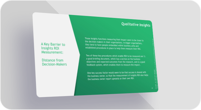 Qualitative Insights . d e v r e Those Insights functions measuring their impact seem to be closer to s e r s t the decision-makers in their organizations. In bigger organizations, h g i r l l A they tend to have people embedded within business units and . k A Key Barrier to r o w established procedures in place to help them measure their ROI. t e N Insights ROI s s e n i s u B Measurement: ch r a Two of these key procedures which enable ROI to be measured are 1) e s e R l a good briefing document, which has a section on the business a b o l G Distance from objectives and expected outcomes from the research, and 2) a good e Th d n a Decision-Makers feedback system, which enables them to measure the impact. c. n I , p u o t r r G o p g e n i R t One key success factor would seem to be that success is shared with l y u d s u n t Co S the business owner, so that the measurement of Insights ROI also helps 7 n 1 o 0 t 2 s o t B the business owner report upwards on their own ROI. ghe i s Th In y f b o 7 OI 1 R 0 2 - © N B t h g i GRr G y C p 39 B Co