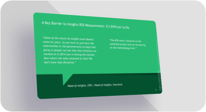 A Key Barrier to Insights ROI Measurement: It’s Difficult to Do . d e v r e “Some of the return on Insights work doesn't “The ROI metric would be on the s e r s t h g i r come for years. So you have to just have the combined project and not necessarily l l A . k r wherewithal or the perseverance to keep that on the methodology level.” o w t e N s s going so people can see that that initiative we e n i s u B worked on in 2014 now is hitting the market. ch r a e s e R Now what's the sales attached to that? We l a b o l G don't have that discipline.” e Th d n a c. n I , p u o t r r G o p g e n i R t l y u d s u n t Co S 7 n 1 o 0 t 2 s o t B ghe i s Th In y f b o 7 Head of Insights, CPG / Head of Insights, Insurance OI 1 R 0 2 - © N B t h g i GRr G y C p 38 B Co