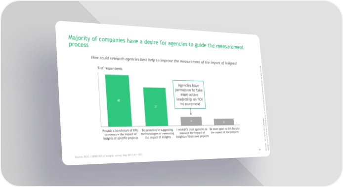 Majority of companies have a desire for agencies to guide the measurement process How could research agencies best help to improve the measurement of the impact of insights? . d e v r e s e r s % of respondents t h g i r l l A . k r o w t e N s Agencies have s e n i s u permission to take B ch r more active a e s e R l leadership on ROI a 48 b o l G measurement e 37 Th d n a c. n I , p u o t r r G o p g 9 e n 6 i R t l y u d s u n t Co S Provide a benchmark of KPIs Be proactive in suggesting I wouldn’t trust agencies to Be more open to link fees to 7 n 1 o 0 t 2 s o to measure the impact of methodologies of measuring measure the impact of the impact of the projects t B ghe i insights of specific projects the impact of insights insights of their own projects s Th In y f b o 7 OI 1 R 0 2 - © N B t h g i GRr G y C p Source: BCG / GRBN ROI of Insights survey, May 2017 (N = 187) 77 B Co