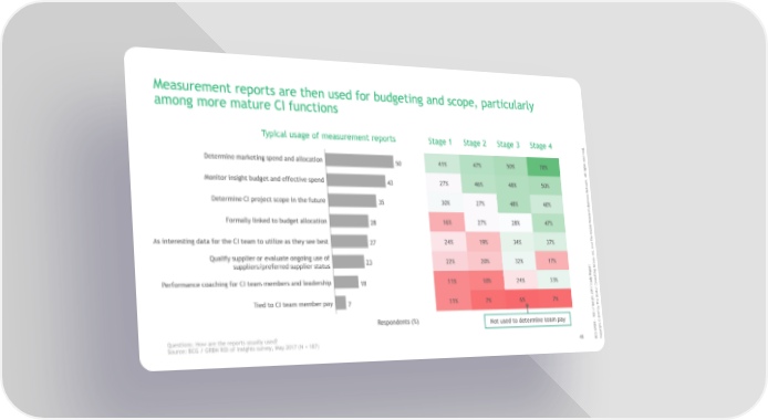Measurement reports are then used for budgeting and scope, particularly among more mature CI functions Typical usage of measurement reports Stage 1 Stage 2 Stage 3 Stage 4 . d e v r e s e r s t h Determine marketing spend and allocation g 50 41% 47% 50% 70% i r l l A . k r o Monitor insight budget and effective spend w 43 27% 46% 48% 50% t e N s s e n i s Determine CI project scope in the future u 35 30% 27% 48% 40% B ch r a e s e R Formally linked to budget allocation 28 16% 27% 28% 47% l a b o l G e Th As interesting data for the CI team to utilize as they see best 24% 19% 34% 37% 27 d n a c. n I Qualify supplier or evaluate ongoing use of , p 23 22% 20% 32% 17% u o suppliers/preferred supplier status t r r G o p g e n i R t l y u Performance coaching for CI team members and leadership d s 18 11% 10% 24% 33% u n t Co S 7 n 1 o 0 t 2 s o t B Tied to CI team member pay 11% 7% 6% 7% 7 ghe i s Th In y f b o 7 OI 1 R 0 Respondents (%) 2 Not used to determine team pay - © N B t h g i Questions: How are the reports usually used? GRr G y Source: BCG / GRBN ROI of Insights survey, May 2017 (N = 187) C p 48 B Co