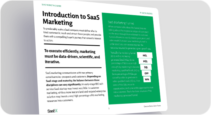 SAAS MARKETING GUIDE BY: JUSTIN TALERICO Introduction to SaaS SaaS Marketing Funnel Marketing When someone talks about the funnel, they are talking about the progressive stages of a prospect To predictably scale, a SaaS company must define who its as the move through from unknown to customer. ideal customer is; reach and attract those people; and provide Funnel efficiencies vary by market, price point, and them with a compelling buyer’s journey that converts interest sales model, but once your marketing funnel is to action. understood, you can reverse engineer the resources required to generate a given growth rate. To execute efficiently, marketing Typically, the marketing funnel must be data-driven, scientific, and starts with a marketing- MGL generated lead (MGL). Some MQL iterative. percentage of MGLs score high enough (by marketing) to become SQL marketing-qualified leads (MQLs). SaaS marketing communicates with two primary Some percentage of MQLs get OPP constituencies: prospects and customers. Depending on scored by sales to graduate to SaaS stage and maturity, the balance between those sales-qualified leads (SQLs). Then WIN disciplines can vary significantly. An early-stage B2C self- some of the SQLs move to service SaaS startup may invest very little in customer opportunities. And some of the opportunities turn marketing, while a more mature land-and-expand enterprise into customers. That’s the basic structure of the solution may invest a very high percentage of its marketing marketing-generated funnel. resources into customers. 5 Execute Better. Grow Faster.