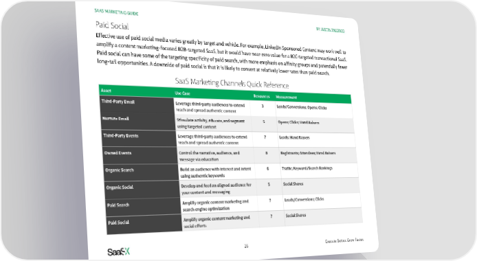 SAAS MARKETING GUIDE BY: JUSTIN TALERICO Paid Social Effective use of paid social media varies greatly by target and vehicle. For example, LinkedIn Sponsored Content may work well to amplify a content marketing-focused B2B-targeted SaaS, but it would have near-zero value for a B2C-targeted transactional SaaS. Paid social can have some of the targeting specificity of paid search, with more emphasis on affinity groups and potentially fewer long-tail opportunities. A downside of paid social is that it is likely to convert at relatively lower rates than paid search. SaaS Marketing Channels Quick Reference Asset Use Case Resources Measurement Third-Party Email Leverage third-party audiences to extend 3 Leads/Conversions; Opens; Clicks reach and spread authentic content Nurture Email Stimulate activity, educate, and segment 5 Opens; Clicks; Hand Raisers using targeted content Third-Party Events Leverage third-party audiences to extend 7 Leads; Hand Raisers reach and spread authentic content Owned Events Control the narrative, audience, and 8 Registrants; Attendees; Hand Raisers message via education Organic Search Build an audience with interest and intent 6 Traffic; Keyword/Search Rankings using authentic keywords Organic Social Develop and feed an aligned audience for 5 Social Shares your content and messaging Paid Search Amplify organic content marketing and 7 Leads/Conversions; Clicks search engine optimization Paid Social Amplify organic content marketing and 7 Social Shares social efforts 26 Execute Better. Grow Faster.
