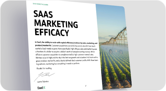 SAAS MARKETING GUIDE BY: JUSTIN TALERICO SAAS MARKETING EFFICACY In SaaS, the ability to scale with capital efficiency is driven by sales, marketing, and product/market fit. Customer acquisition cost (CAC) has a lot to do with how much capital a SaaS needs to grow. More specifically, high-efficacy sales and marketing uses a fraction of a dollar to acquire a dollar’s worth of annual recurring revenue. When efficient customer acquisition is complemented by high customer renewal rates, lifetime value is high and the sky’s the limit on growth and valuation. It all starts with a great product, market fit, and a clearly defined ideal customer profile. With those basic ingredients, marketing has everything it needs to perform. Thanks for reading. Justin Talerico 27 Execute Better. Grow Faster.