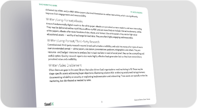 SAAS MARKETING GUIDE BY: JUSTIN TALERICO delivered via HTML and/or PDF. White papers also lend themselves to online interactivity, which can significantly improve their engagement and measurability. Written/Long-Format/eBooks A more fundamentally digital cousin to the white paper, eBooks are perceived as more modern, and more interesting. They may be delivered online via HTML or offline via PDF, and are more likely to include interactive elements. Unlike white papers, eBooks offer more freedom of size, shape, and format. Like white papers, they can be high-value educational assets — worthy of exchange for lead data. They are often highly engaging and measurable. Written/Long-Format/Third-Party Research Commissioned third-party research reports breed authoritative credibility, and scale into many other types of assets over an extended period — white papers, calculators, presentations, podcasts, infographics, and others. They are resource- and budget-intensive to produce, but in SaaS markets in need of social proof, they can be a compelling and useful option. Quality research reports also make highly effective lead-generation bait as they have extraordinary perceived value and credibility. Written/Sales Enablement Often there are gaps in the asset library that sales-driven SaaS organizations need marketing to fill. These may be stage-specific assets addressing buyer objections; illustrating solution ROI; reinforcing social proof/ratings/reviews; documenting reliability or security, or explaining implementation and onboarding. These assets are typically written by marketing, but distributed as needed by sales. 13 Execute Better. Grow Faster.