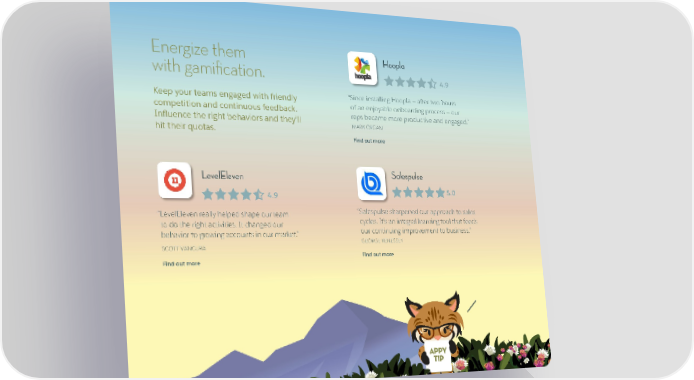 Energize them Hoopla with gamification. 4.9 Keep your teams engaged with friendly “ Since installing Hoopla — after two hours competition and continuous feedback. of an enjoyable onboarding process — our reps became more productive and engaged.” Influence the right behaviors and they’ll hit their quotas. MARK ORGAN Find out more LevelEleven Salespulse 4.9 5.0 “ LevelEleven really helped shape our team “ Salespulse sharpened our approach to sales to do the right activities. It changed our cycles. It’s an integral learning tool that feeds behavior to growing accounts in our market.” our continuing improvement to business.” GEORGE KENESSEY SCOTT VANCURA Find out more Find out more APPY TIP