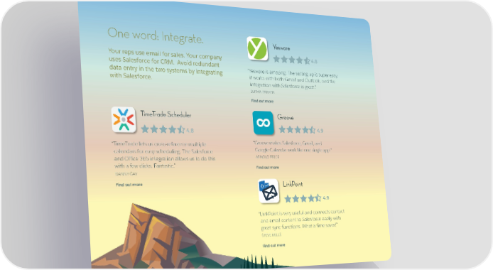 One word: Integrate. Yesware Your reps use email for sales. Your company 4.8 uses Salesforce for CRM. Avoid redundant “ Yesware is amazing! The setting up is super easy, data entry in the two systems by integrating it works with both Gmail and Outlook, and the with Salesforce. integration with Salesforce is great.” SUTHA PARATH Find out more TimeTrade Scheduler Groove 4.8 4.9 “ TimeTrade lets us cross-reference multiple “ Groove makes Salesforce, Gmail, and calendars for easy scheduling. The Salesforce Google Calendar work like one single app!” ARNOLD PRICE and Office 365 integration allows us to do this with a few clicks. Fantastic.” Find out more DANNY GAY Find out more LinkPoint 4.9 “ LinkPoint is very useful and connects contact and email content to Salesforce easily with great sync functions. What a time saver!” STEVE MILLS Find out more