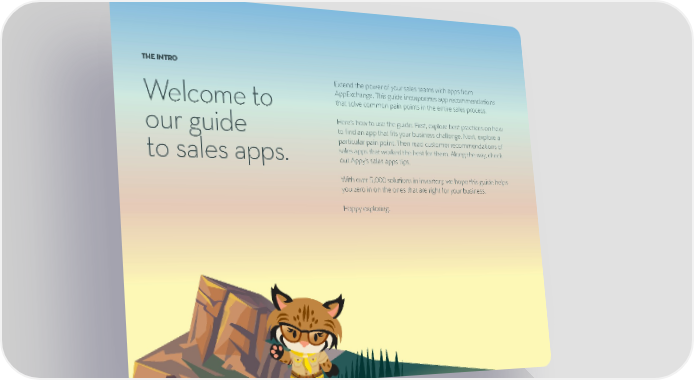 THE INTRO Extend the power of your sales teams with apps from AppExchange. This guide incorporates app recommendations Welcome to that solve common pain points in the entire sales process. Here’s how to use the guide: First, explore best practices on how our guide to find an app that fits your business challenge. Next, explore a particular pain point. Then read customer recommendations of to sales apps. sales apps that worked the best for them. Along the way, check out Appy’s sales apps tips. With over 5,000 solutions in inventory, we hope this guide helps you zero in on the ones that are right for your business. Happy exploring.