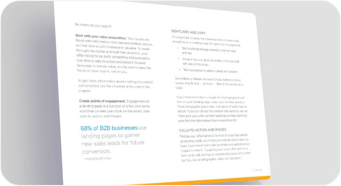 So where do you begin? SIGHTLINES AND COPY It’s important to keep the following facts in mind when . Your buyers are Start with your value proposition designing your landing page for optimum engagement: faced with information overload and endless options, • Text is almost always scanned, and not read so their time is both limited and valuable. To break entirely. through the clutter and hold their attention, your offer needs to be both compelling and persuasive. • Greater focus is given to words in the top and Use strong calls-to-action and benefit-focused left side of the page. language to convey value, and be sure to keep the • Text is scanned in what’s called an f-pattern. focus on your buyers, not on you. According to nielsen norman Group, before a visitor To get more information about crafting the perfect leaves, they’ll read — at most — 28% of the words on a call-to-action, see the checklist at the end of this page. chapter. If you need more than a couple of short paragraphs of Create points of engagement. engagement on text on your landing page, make sure the first words in a landing page is a function of a few core items: those paragraphs give a clear indication of what they’re sightlines (where users look on the page), copy, about. If you can divide the content into sections, do so! calls-to-action, and images. Make sure you write concise headings to help scanning eyes find the information they’re searching for. 68% of B2B businesses use CALLS-TO-ACTION AND ImAGES landing pages to garner Placing your offer behind a form is an essential part of new sales leads for future generating leads, but it helps to include some value up conversion. front. experiment with calls-to-action and gated versus ungated content. Try gating your main offer behind a - MarketingSherpa form while still sharing an unprotected piece of content for free, like an infographic, video, or calculator. 5 / Pardot