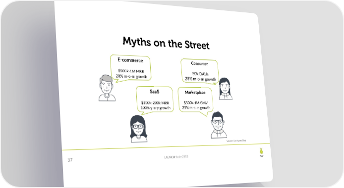 Myths on the Street E-commerce Consumer $500k-1M MRR 50k DAUs 20% m-o-m growth 25% m-o-m growth SaaS Marketplace $100k-200k MRR $500k-1M GMV 100% y-o-y growth 25% m-o-m growth Source: Equityzen blog 37 LAUNCH Scale 2018 Pear