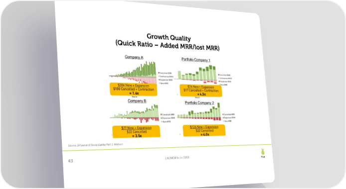 Growth Quality (Quick Ratio – Added MRR/lost MRR) Source: Diligence at Social Capital Part 1. Medium 43 LAUNCH Scale 2018 Pear