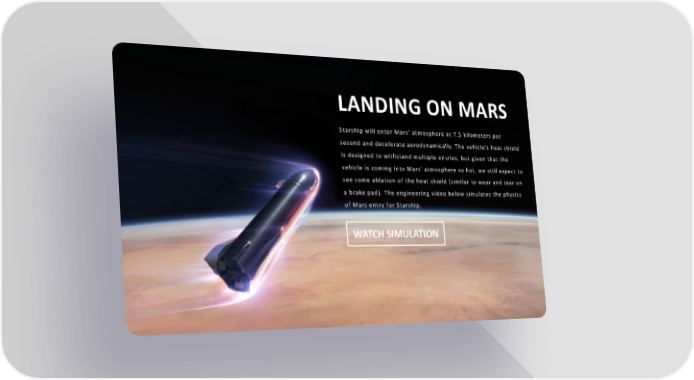LANDING ON MARS Starship will enter Mars’ atmosphere at 7.5 kilometers per second and decelerate aerodynamically. The vehicle’s heat shield is designed to withstand multiple entries, but given that the vehicle is coming into Mars' atmosphere so hot, we still expect to see some ablation of the heat shield (similar to wear and tear on a brake pad). The engineering video below simulates the physics of Mars entry for Starship. WATCH SIMULATION