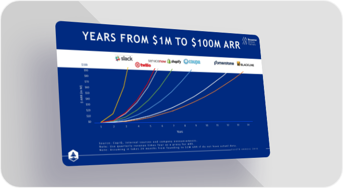 YEARS FROM $1M TO $100M ARR $100 $100 $90 $80 $70 M)in $60 (R $50 AR$ $40 $30 $20 $10 $0 1 2 3 4 5 6 7 8 9 10 11 12 13 14 Years S o u r c e : C a p I Q , i n t e r n a l s o u r c e s a n d c o m p a n y a n n o u n c e m e n t s . Note: Use quarterly revenue times four as a proxy for ARR. Note: Assuming it takes 24 months from founding to $1M ARR if do not have actual data. S A A S T R A N N U A L 2 0 1 9