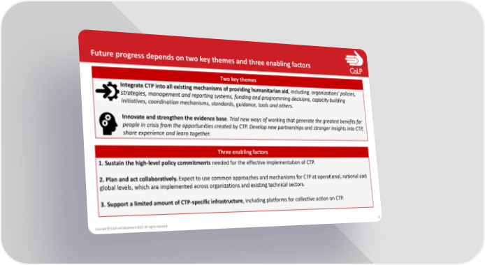 Future progress depends on two key themes and three enabling factors Two key themes Integrate CTP into all existing mechanisms of providing humanitarian aid, including: organizations’ policies, strategies, management and reporting systems, funding and programming decisions, capacity building initiatives, coordination mechanisms, standards, guidance, tools and others. Innovate and strengthen the evidence base. Trial new ways of working that generate the greatest benefits for people in crisis from the opportunities created by CTP. Develop new partnerships and stronger insights into CTP, share experience and learn together. Three enabling factors 1. Sustain the high-level policy commitments needed for the effective implementation of CTP. 2. Plan and act collaboratively. Expect to use common approaches and mechanisms for CTP at operational, national and global levels, which are implemented across organizations and existing technical sectors. 3. Support a limited amount of CTP-specific infrastructure, including platforms for collective action on CTP. Copyright © CaLPand Accenture 2017. All rights reserved 15