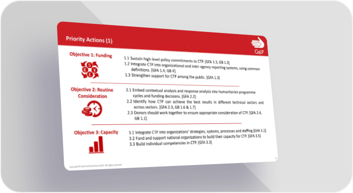 Priority Actions (1) Objective 1: Funding 1.1 Sustain high-level policy commitments to CTP. [GFA 1.3, GB 1.3] 1.2 Integrate CTP into organizational and inter-agency reporting systems, using common definitions. [GFA 1.4, GB 4] 1.3 Strengthen support for CTP among the public. [GFA 1.3] Objective 2: Routine 2.1 Embed contextual analysis and response analysis into humanitarian programme Consideration cycles and funding decisions. [GFA 2.2] 2.2 Identify how CTP can achieve the best results in different technical sectors and across sectors. [GFA 2.3, GB 1.6 & 1.7] 2.3 Donors should work together to ensure appropriate consideration of CTP. [GFA 2.4, GB 1.1] Objective 3: Capacity 3.1 Integrate CTP into organizations’ strategies, systems, processes and staffing [GFA 3.2] 3.2 Fund and support national organizations to build their capacity for CTP. [GFA 3.5] 3.3 Build individual competencies in CTP. [GFA 3.3] Copyright © CaLPand Accenture 2017. All rights reserved 13